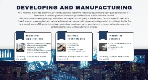 For over 30 years, MTM Power® is developing and manufacturing power supplies and transformers for industrial, railway and power engineering applications in Germany. MTM Power has its own R&D department, an own EMC laboratory, state-of-the-art technical equipment and highly qualified employees in all departments to continously maintain the technological leadership and produce innovative solutions.